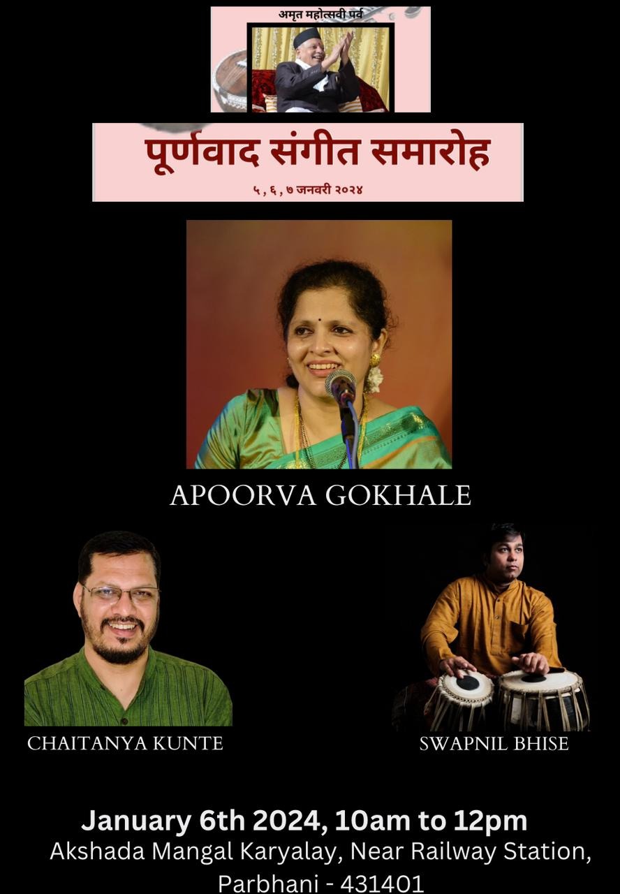 | 7. | Purnavad music festival | January 6th 2024 | 10am to 12pm | Akshada Mangal Karyalay, Near Railway Station, Parbhani - 431401. | Tabla :-Swapnil Bhise Harmonium :- Chaitanya |
