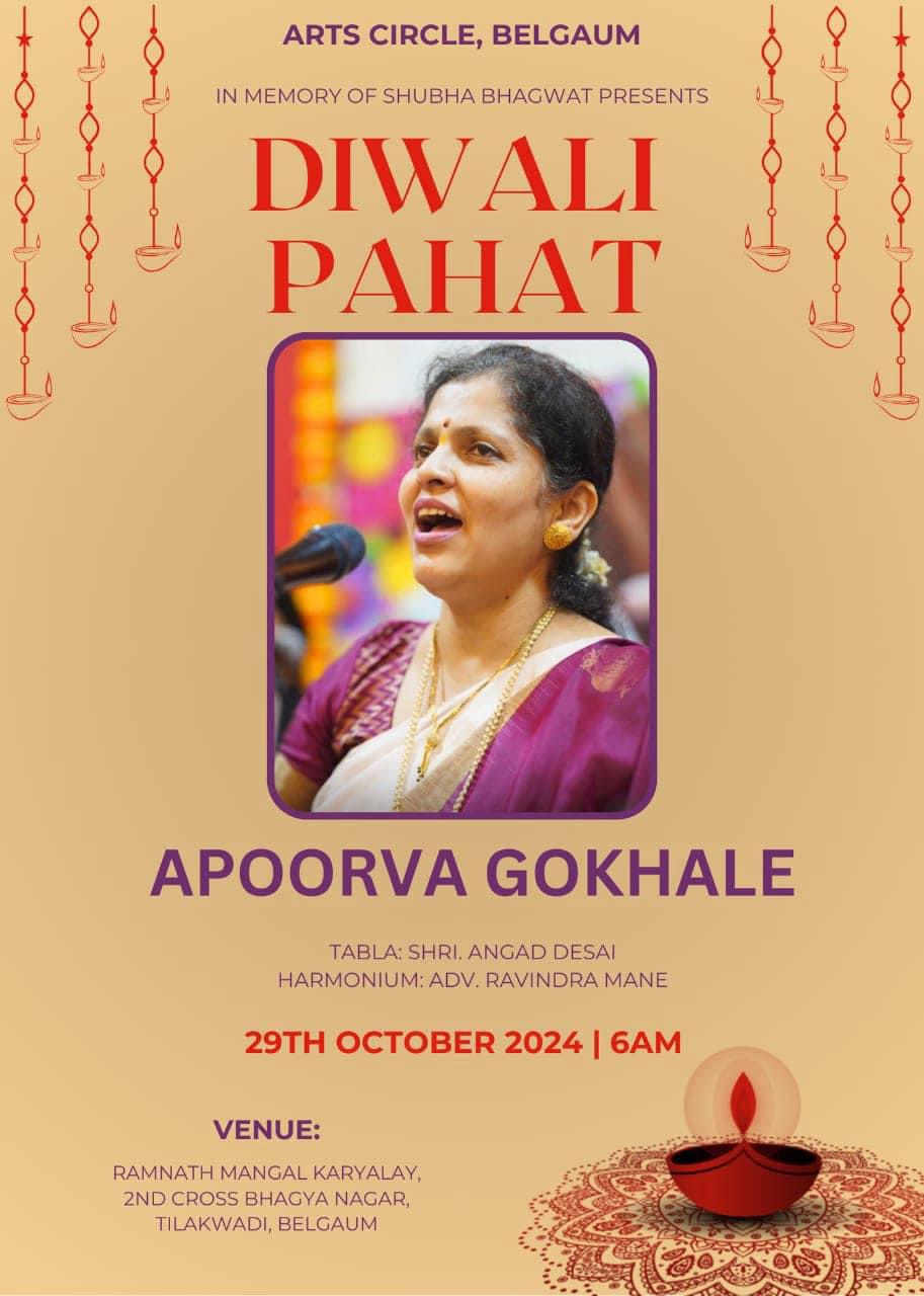 | 6. | Arts Circle, Belgaum in memory of Shubha Bhagwat ji on the occasion of Diwali Pahat. | October 29 2024 | 6.00 am onwards | Ramnath Mangal Karyalay 2nd Cross Bhagyanagar, Tilakwadi, Belgaum | Tabla :- Shri Angad Desai Harmonium :- Adv. Ravindra Mane |