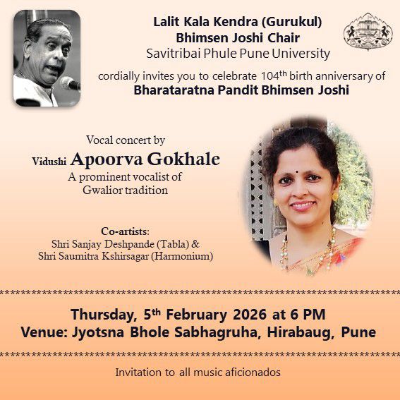 | 5. | 104th Birth Anniversary Celebration of Bharatratna Pt. Bhimsen Josh | February 5th 2026 | 6.00 am onwards | Jyotsna Bhole Sabhagruha, Hirabaug, Pune | Tabla :- Shri Sanjay Deshpande Harmonium :- Shri Saumitra Kshirsagar |