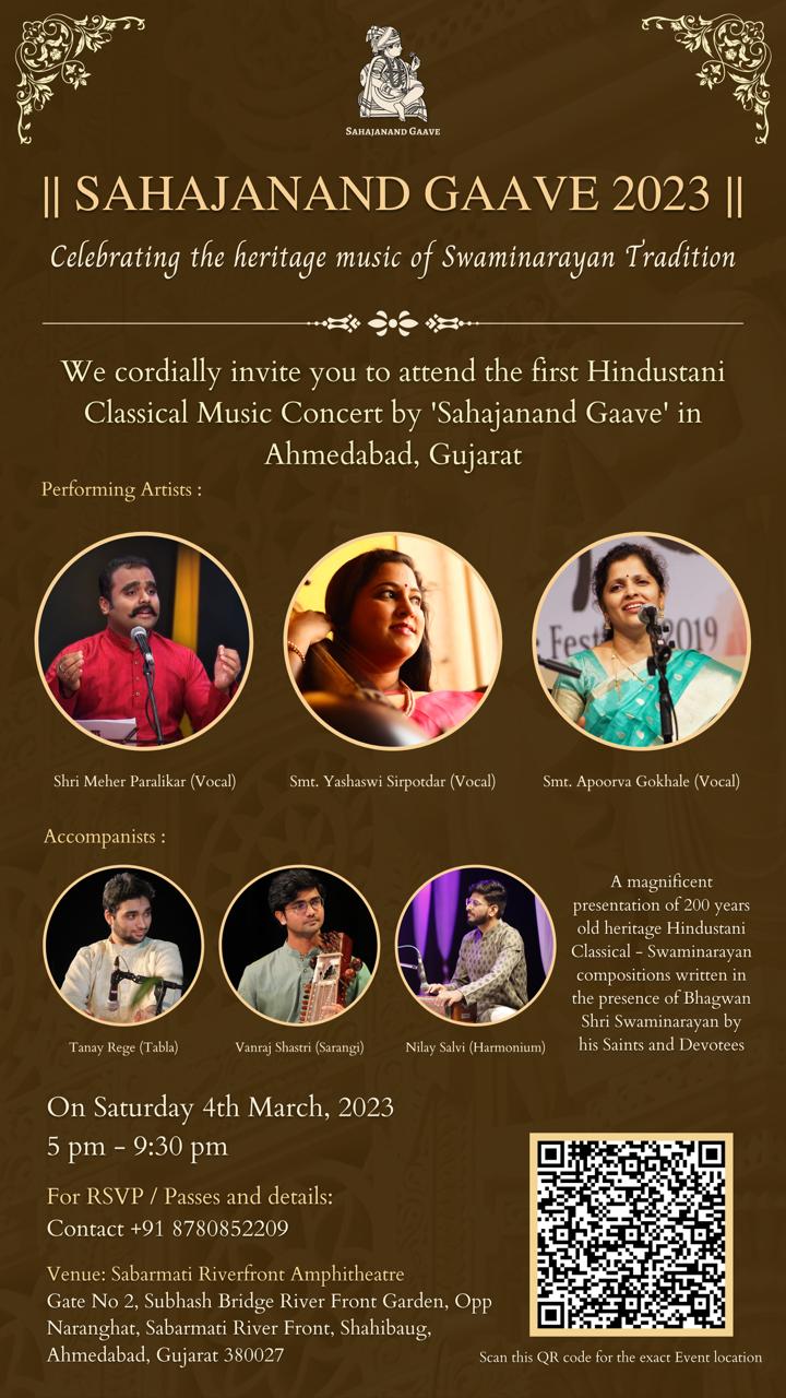 | 8. | Sahajanand Gaave 2023 | Saturday, 4th March 2023 | 7:00 PM | Sabarmati River Front Ampitheatre , Gate No. 2, Subhash Bridge, River front Garden, Opp. Naranghat, Sabarmati River Front, Shahibaug, Ahmedabad , Gujrat 380027 | Tabla :- Tanay Rege Harmonium :- Nilay Salvi |